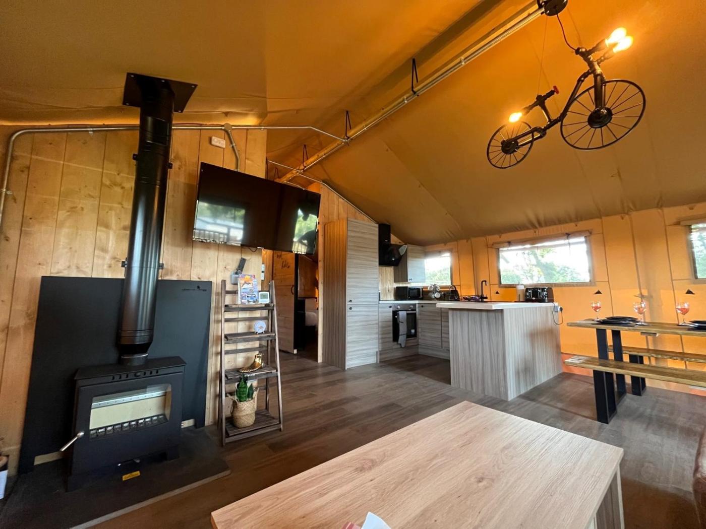 With free WiFi, this luxury tent provides a satellite TV, a washing machine and a fully equipped kitchen with a dishwasher and oven. Towels and bed linen are featured in the luxury tent. There is also a seating area and a fireplace.